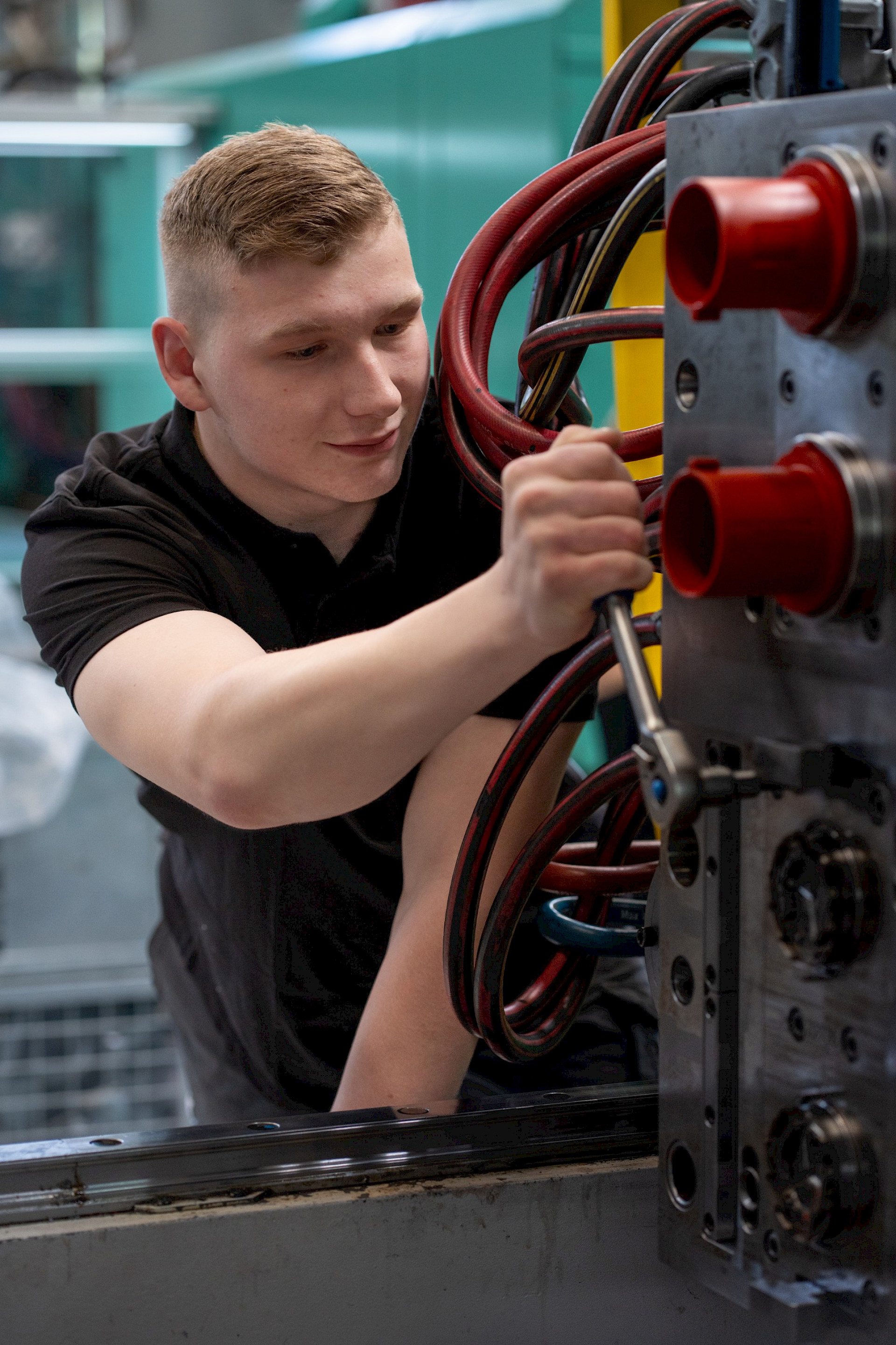 Während der Führung können Sie ein Schaurüsten einer Spritzgießmaschine erleben und einen Stecker montieren.